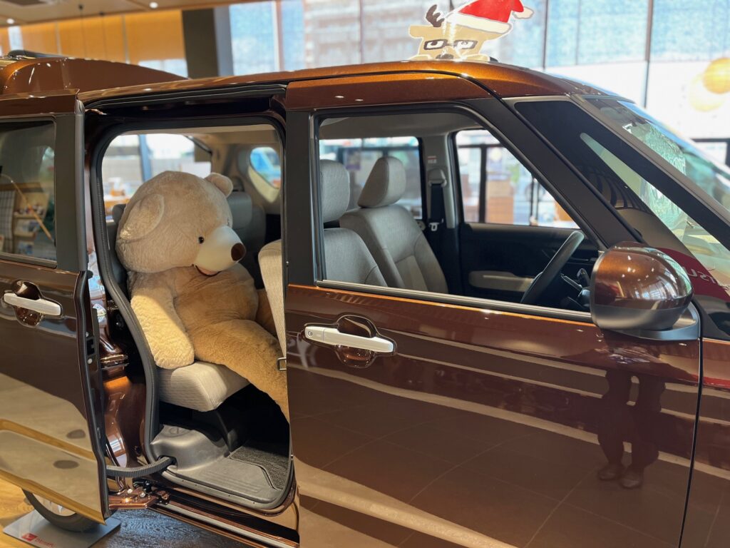 ベージュのクマさんは展示車ムーヴの後部座席に
