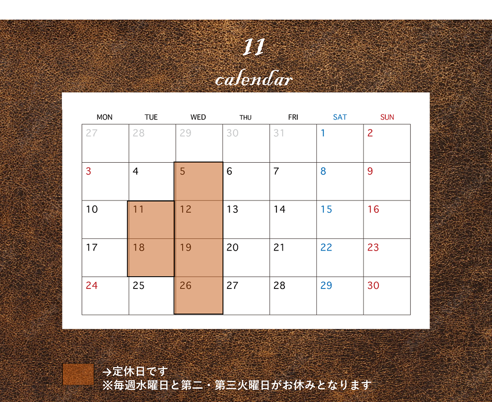 11月は毎週水曜日と第2・第3火曜日が定休日となります。