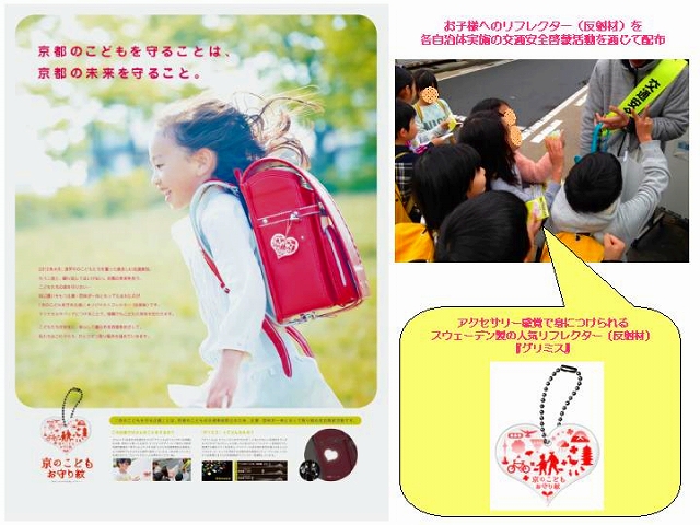 京都府交通対策協議会、各自治体の交通安全啓蒙活動を通じてアクセサリー感覚で身につけられるリフレクター(反射材)をこどもたちに届けています。
