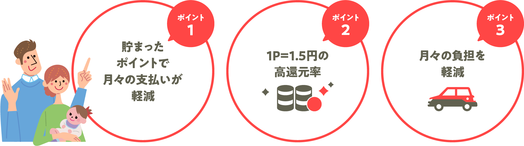 毎月の充当金額は、毎月のお車のクレジット支払い金額が上限となります。 ポイント充当には、ポイント残高が300ポイント以上必要です。300ポイントに満たない場合には翌月以降に繰り越しされます。 |